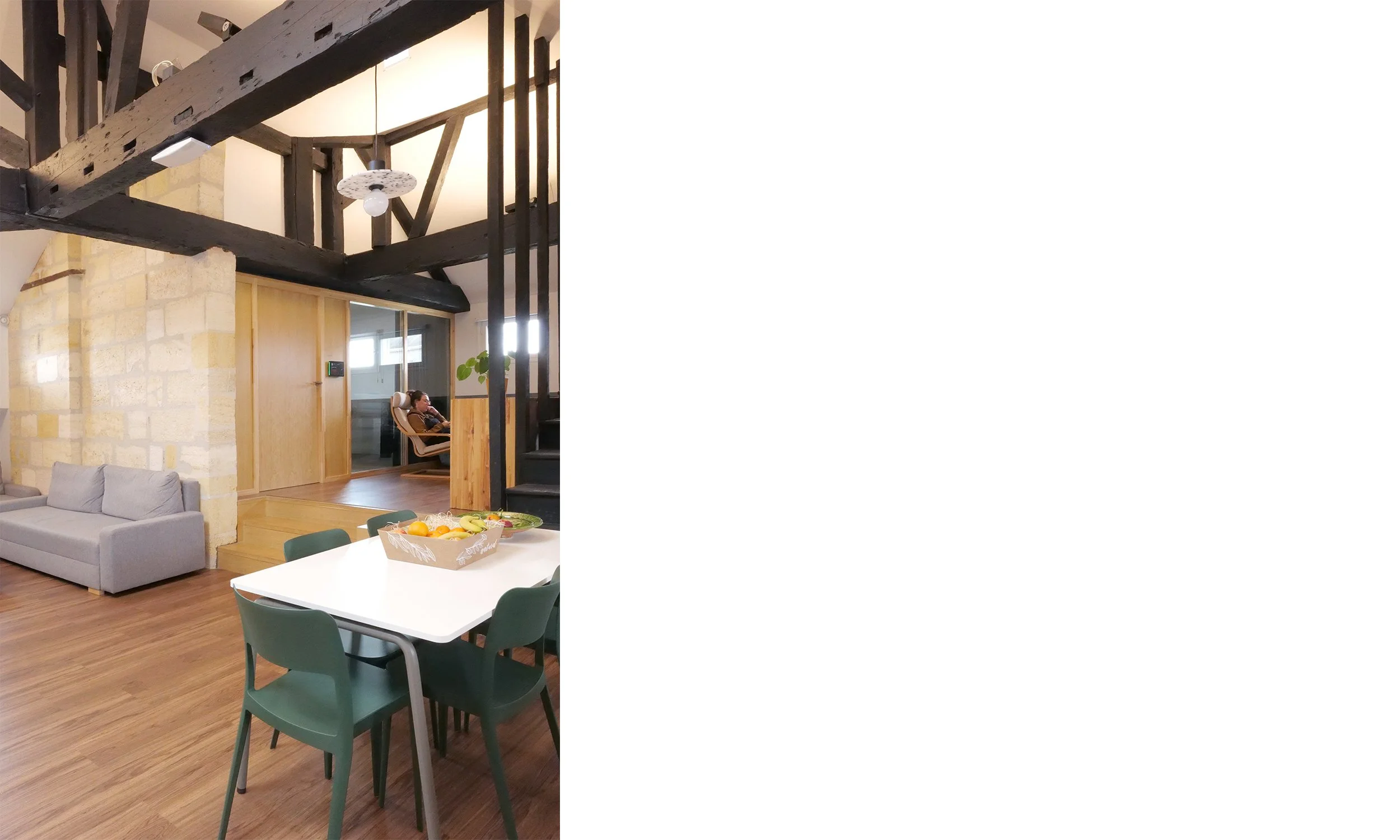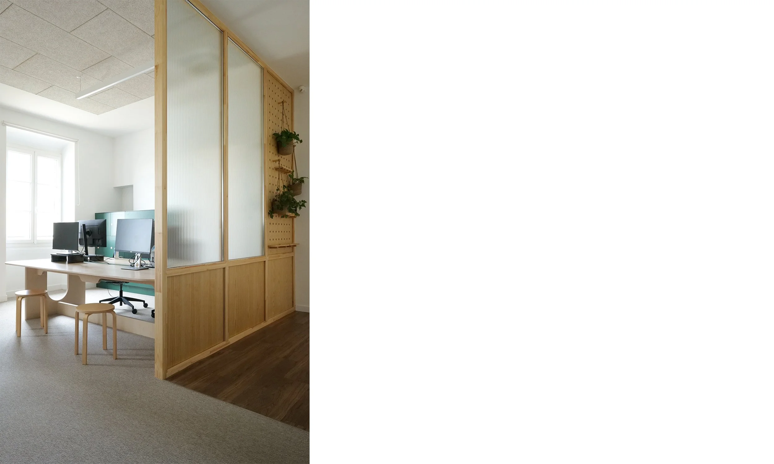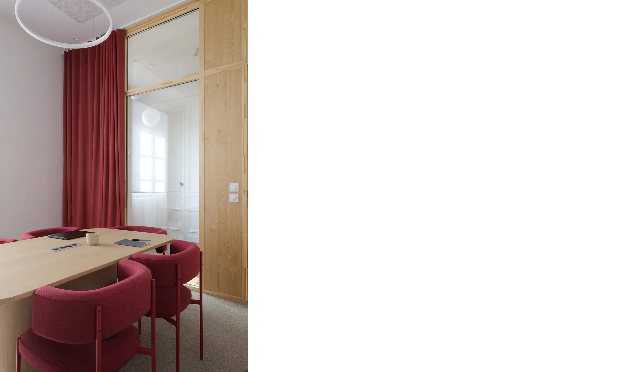 Le projet s’inscrit également dans une démarche éco- responsable, avec un accent sur le reemploi du mobilier existant, la sélection de matériaux biosourcés et recyclés, ainsi que le soutien aux entreprises locales. Chaque décision a été guidée par la volonté de minimiser l’impact environnemental tout en garantissant la durabilité et la pérennité des aménagements. Enfin, la fonctionnalité était au cœur de la conception, avec une clarification du parcours des usagers et la sécurisation des accès, créant ainsi un environnement de travail à la fois pratique et agréable.