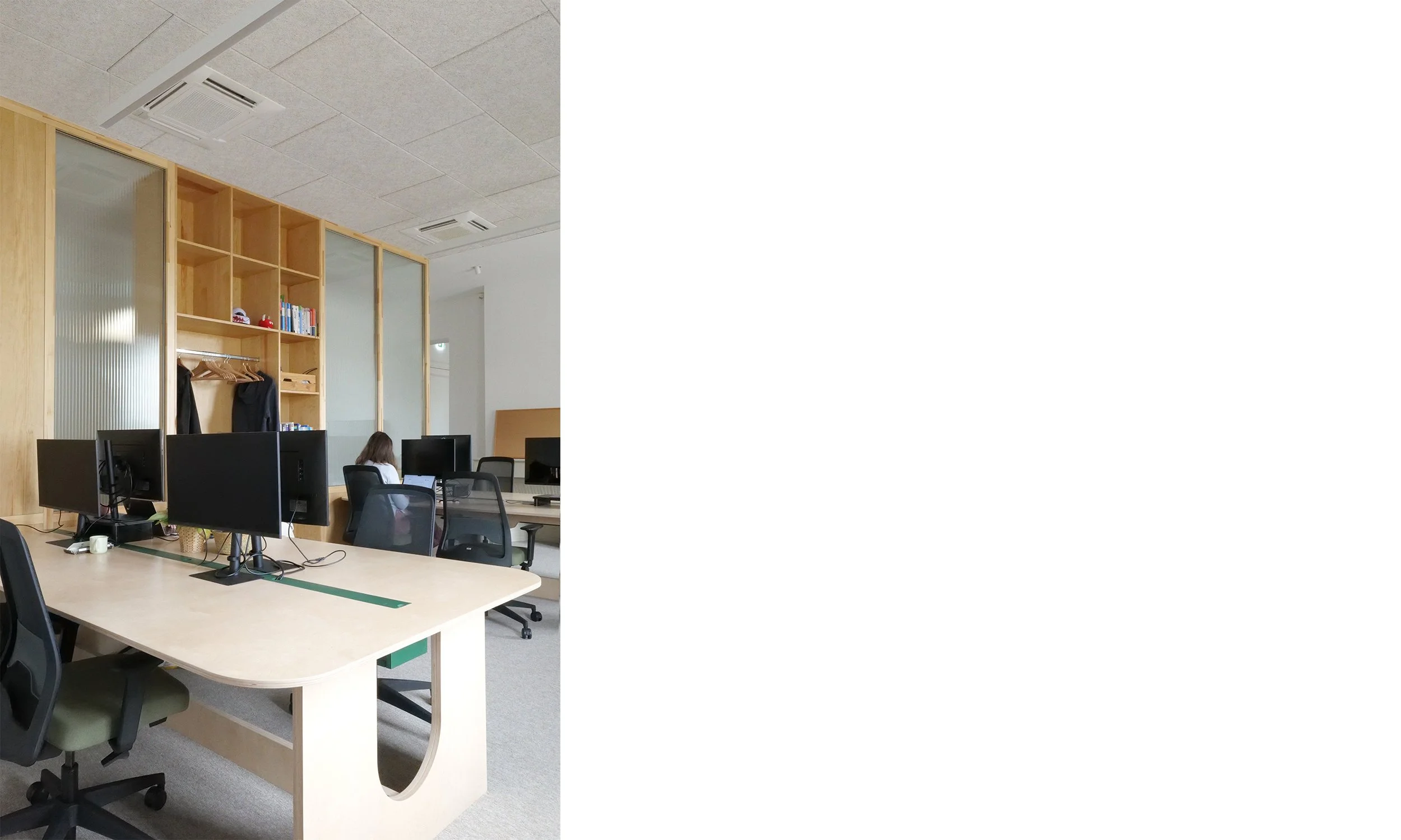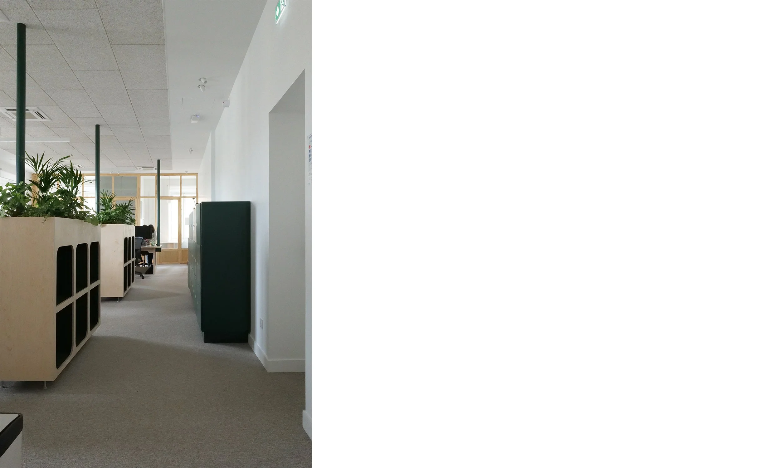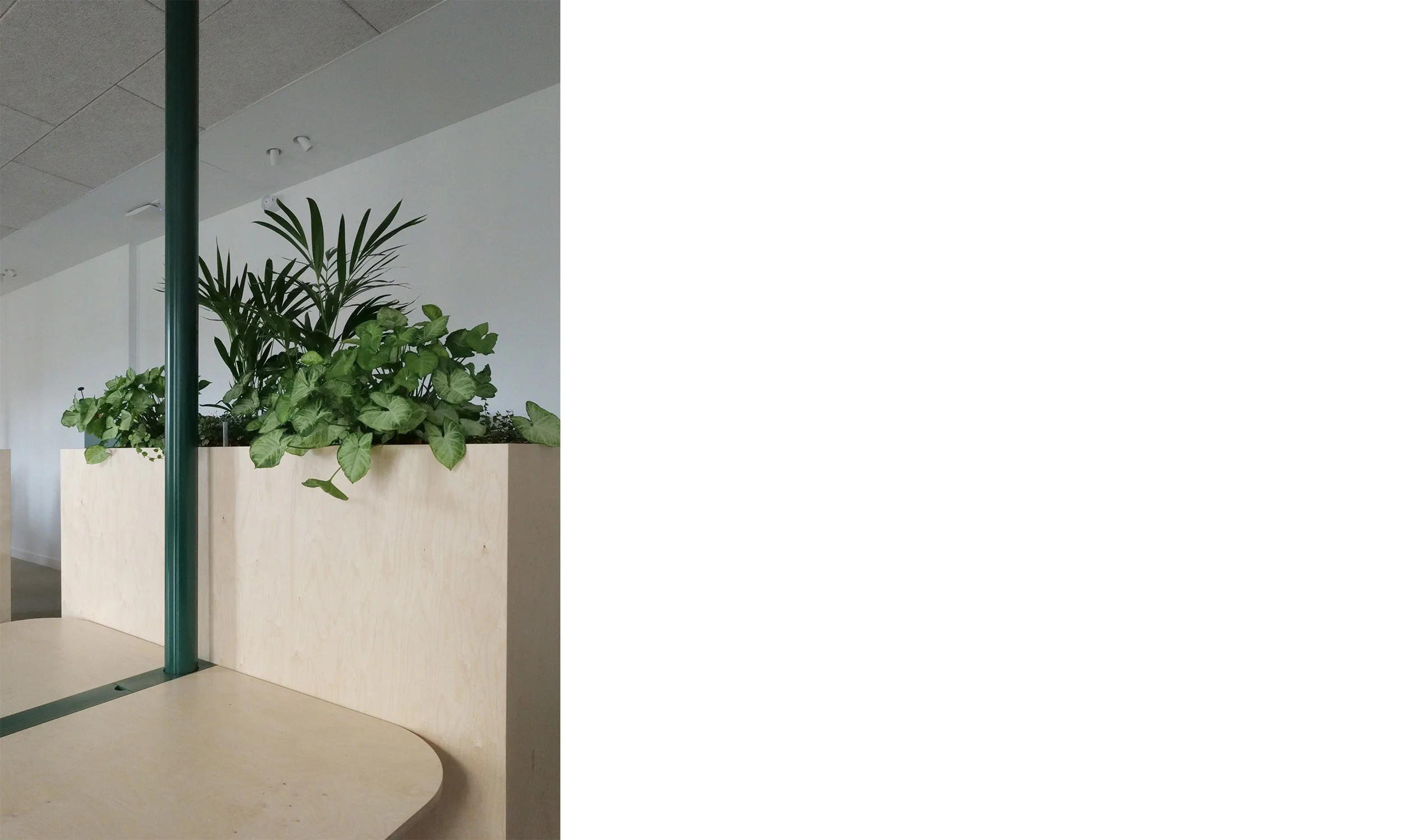 Le projet s’inscrit également dans une démarche éco- responsable, avec un accent sur le reemploi du mobilier existant, la sélection de matériaux biosourcés et recyclés, ainsi que le soutien aux entreprises locales. Chaque décision a été guidée par la volonté de minimiser l’impact environnemental tout en garantissant la durabilité et la pérennité des aménagements. Enfin, la fonctionnalité était au cœur de la conception, avec une clarification du parcours des usagers et la sécurisation des accès, créant ainsi un environnement de travail à la fois pratique et agréable.